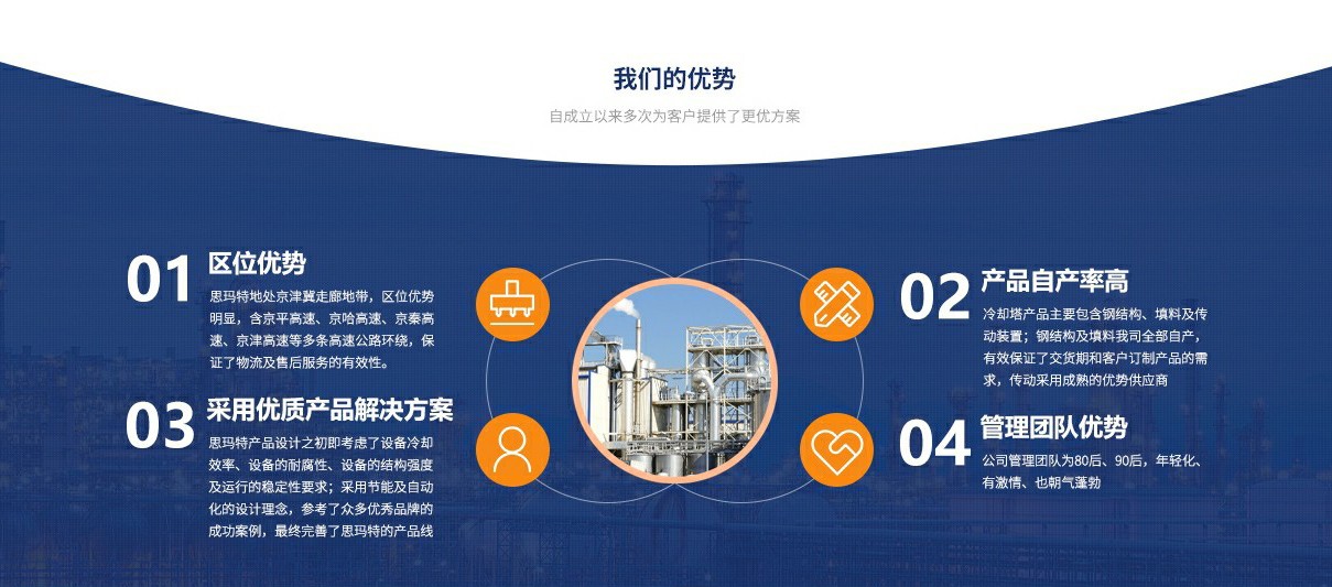 我們賦予了公司Smart(思瑪特)的品牌名稱(chēng),意在作為冷卻塔設(shè)備生產(chǎn)廠家,可以生產(chǎn)出智能化、高效率、節(jié)能、節(jié)水的蒸發(fā)式制冷設(shè)備產(chǎn)品服務(wù)于廣大客戶。